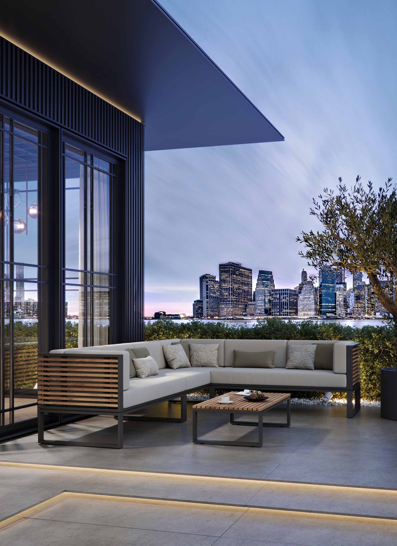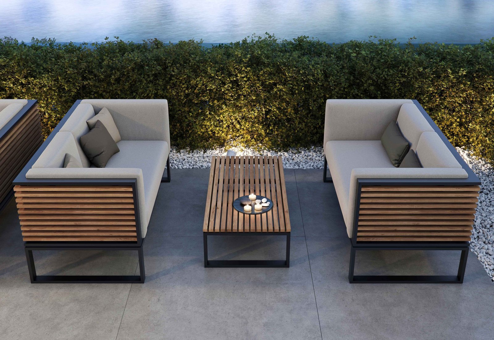 Hanoi allows you to create different and harmonious combinations in your space. Hanoi modular sofas are made up of individual sections and modules that can be arranged to suit your needs and preferences. This allows for great flexibility and versatility, as the sofa can be configured to fit a variety of spaces and styles. With warm effect of wood and the durability of aluminium, it gives an impressive atmosphere to your spaces.